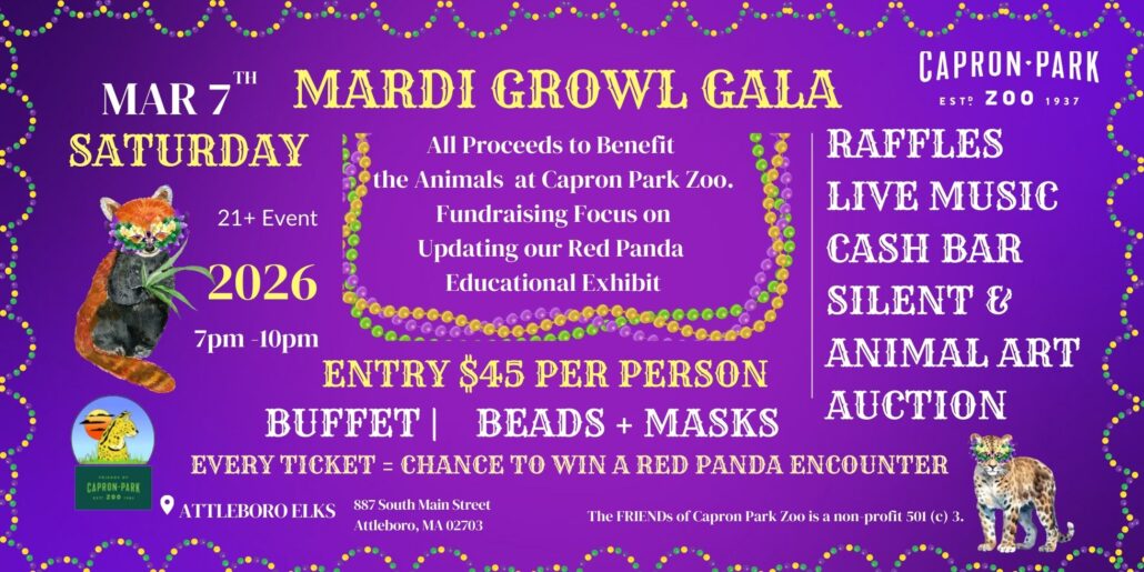 Friends of Capron Park Zoo host a variety of events throughout the year, both on site at the Zoo and offsite at community or private venues. Each unique event helps to support the Zoo’s mission of delivering education, conservation and recreation into every zoo experience.